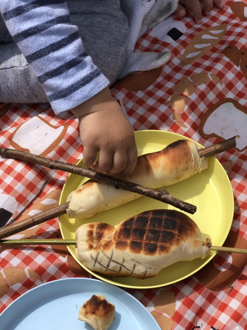 木の上で食べるパンは最高っ