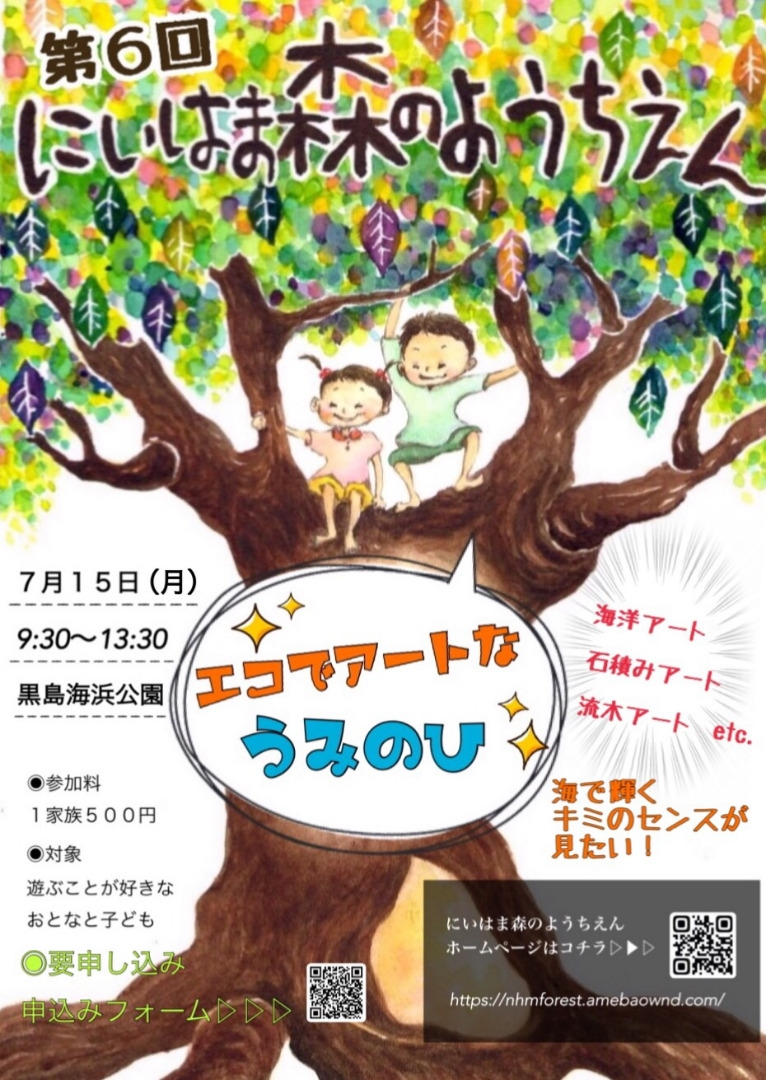 第6回にいはま森のようちえん~エコでアートなうみのひ~ Posted on 2019年6月26日 お待たせしました! 海の日プロジェクト。 海の日はやっぱり海で過ごさなくっちゃ! 知る人ぞ知る黒島海浜公園の海岸で 楽しく遊びましょう お申込みフォーム ↑クリックして別窓が開きます。