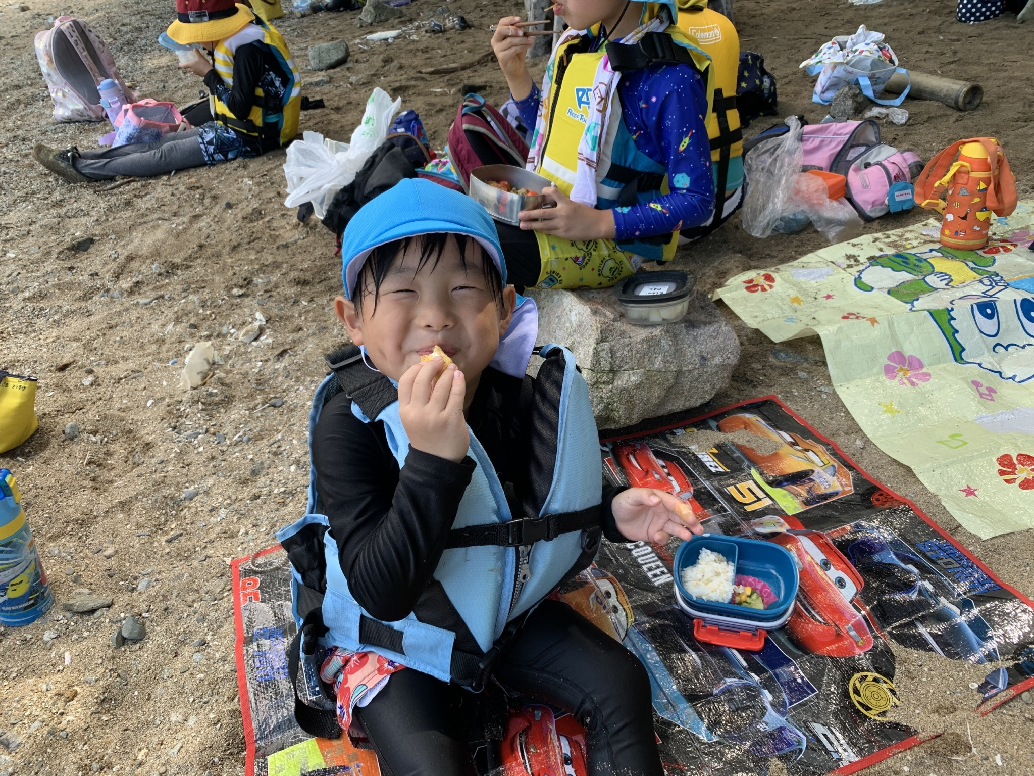 その焚火を一生懸命点けようとするおともだち、火はそっちのけで真っ先に水に飛び込むおともだち。みんなそれぞれです。