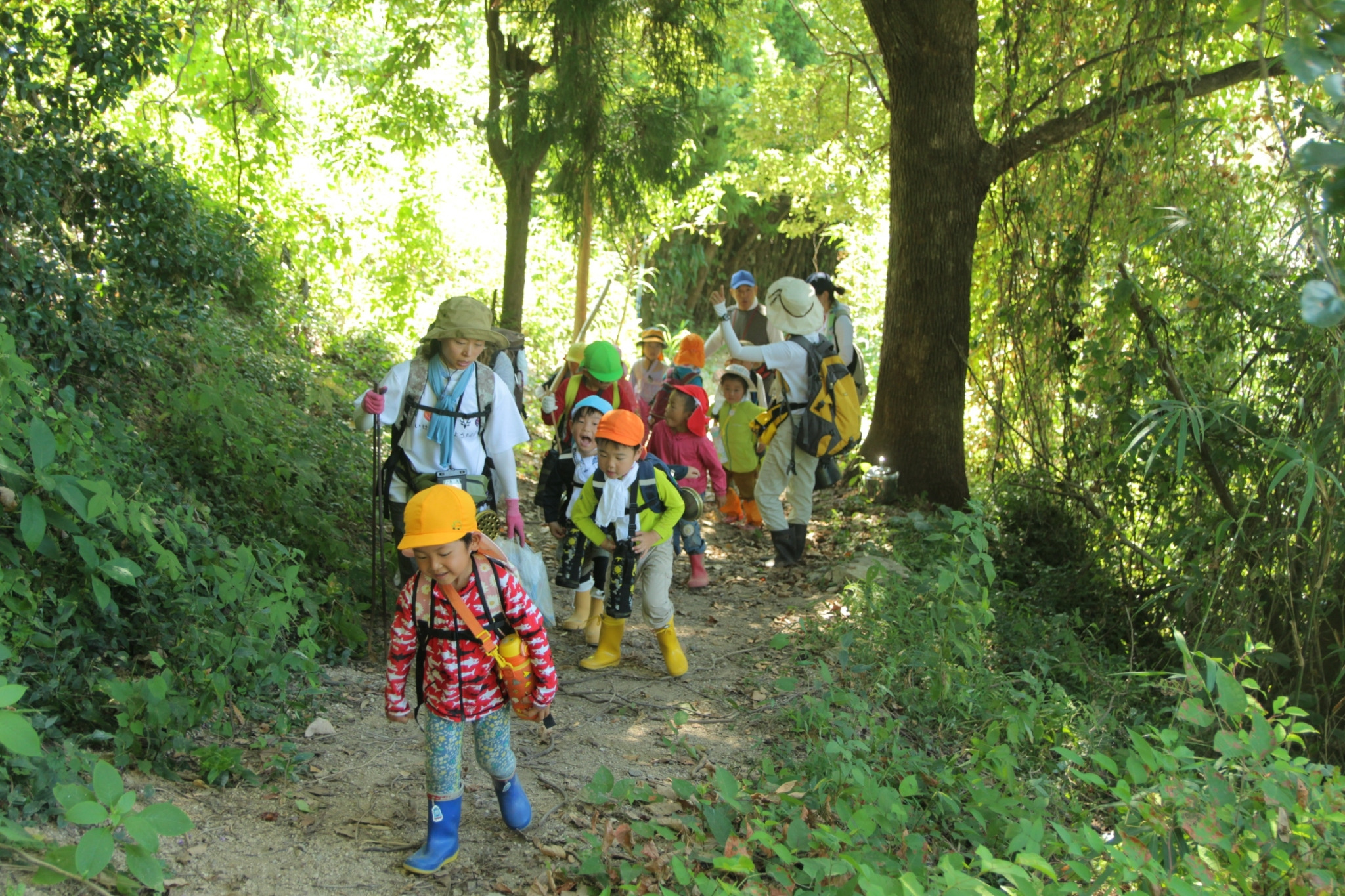 道の先にいそぐおともだち、歩きながら虫を探すおともだち、景色を楽しむおともだち、あっちへ行ったり、こっちへ行ったり、木に登ったり、枝を拾って振り回したり・・・・・・みんなそれぞれ山を楽しんでいるようです。