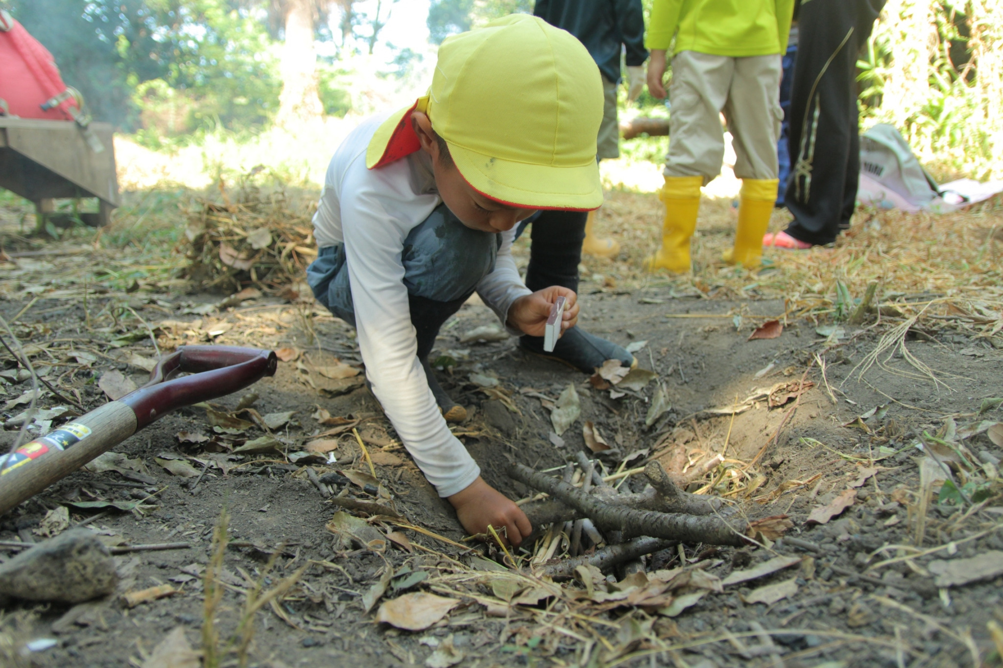 火をつけながら木の棒の先に白い煙が上がるのが不思議な子。観察力が研ぎ澄まされます。